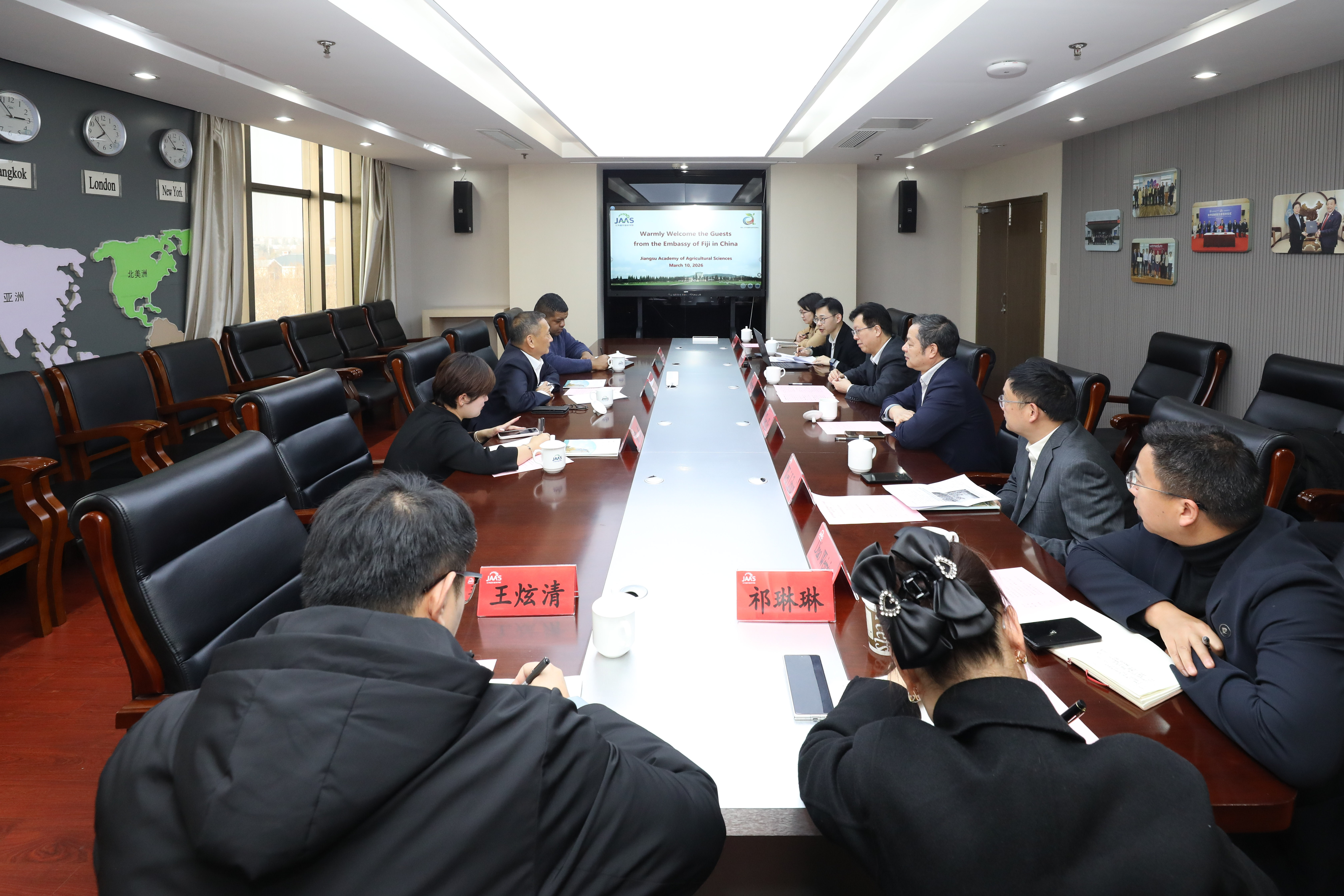 王克华对李振凡大使一行的到访表示欢迎,并介绍了我院发展历程、学科布局、科技创新、人才队伍及国际合作工作情况,特别是围绕太平洋岛国等地区开展的农业务实合作和取得的成效,并回顾了我院与斐济的合作历程。他指出,我院始终秉持开放办院理念,与太平洋岛国合作基础扎实、成效显著,依托中国—太平洋岛国农业合作示范中心,已在斐济实施蔬菜、土壤改良等多个合作项目,前期工作得到当地高度认可。他强调,农业合作高度依赖资源禀赋与市场需求,希望双方在已有合作基础上,进一步加强资源对接与政策协同,推动形成政府引导、技术支撑、企业参与的合作模式,为斐济农业发展和粮食安全贡献江苏农科力量。